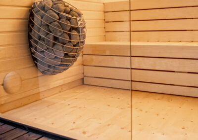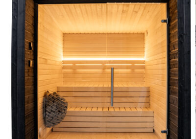 La grande façade vitrée offre une vue imprenable sur le paysage pendant votre séance de sauna.