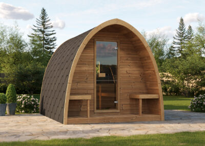 Le sauna extérieur POD 300 est fabriqué en bois d’épicéa à croissance lente des forêts nordiques, gage de stabilité et de longévité.