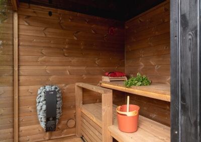 Le sauna est en épicéa issu des forêts d’Europe du nord à croissance lente et les bancs sont en aulne qui ne transmets pas la chaleur pendant les séances.