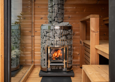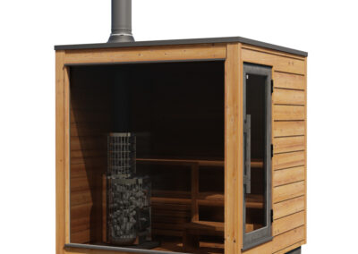 Le sauna Kirami M Down peut être chauffé par un poêle électrique ou à bois.