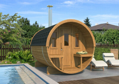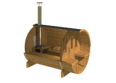 Sauna extérieur de forme tonneau, parfait pour partager des moments de détente entre amis.